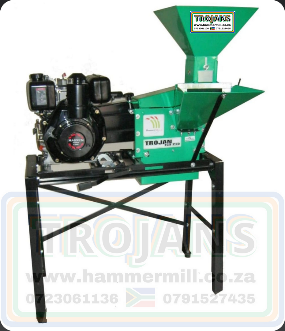 Trojan TGS210P MegaMill 7HP diesel belt driven hammer mill, with 2 blades and 10 hammers that can grind and shred any wet or dry product for human and animal consumption.